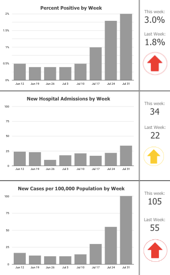 Over the past week, the number of cases per 100,000 people rose from 55 to 105.