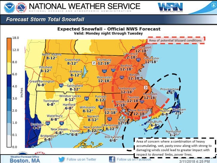 A minimum of a foot of snow is expected for nearly the whole state, with the Providence area at risk of blizzard conditions. The East Bay and Mass.'s South Coast and Cape are of particular concern, with "heavy, accumulating, wet, pasty snow along with strong to damaging winds could lead to greater impact with respect to downed limbs, power lines," the NWS said.