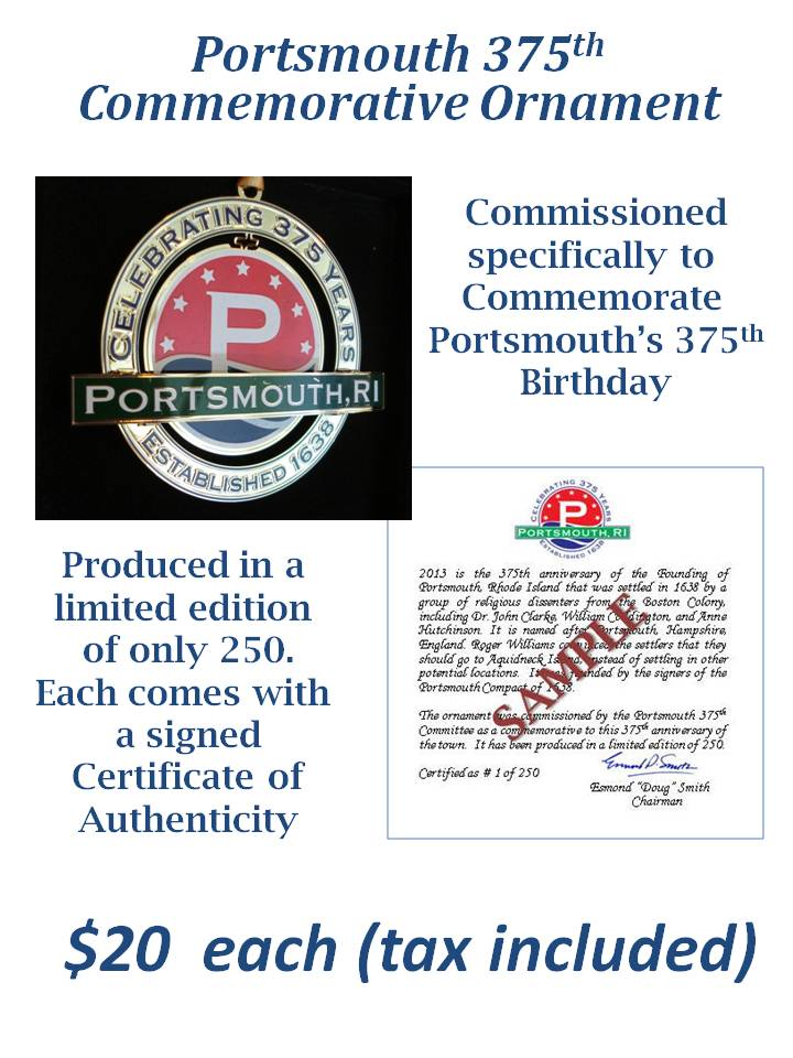 Our 375th limited edition ornaments are quickly selling out. Less than 40 remain at our outlets: Clement's Market (One of our Heritage Sponsors), The People's Credit Union, The Portsmouth Free Public Library and Cory Farms. These keepsakes make great Christmas presents and will remind future generations of the great 375th anniversary year we have had in our Town. Your purchase of these will also support the establishment of a dedicated space in the Portsmouth Free Library for the study of Portsmouth History.Â