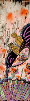 In stark contrast to Reno's subdued colors and darker imagery are a series of pieces inspired by Peruvian petroglyphs created by Providence artist Andrew Sloan. Sloan, who utilizes bright, bold colors on found pieces of wood and other mediums, crafts a cheerful vibe reminiscent of street art.