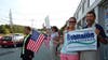 The small group gathered outside the Republican Town Committee headquarters on East Main Road. They held up campaign signs and American flags, and waved to the passing cars.