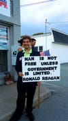 Grapentine held up a sign Wednesday reading "Man is not free unless government is limited," quoting President Ronald Reagan.