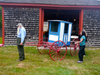 Mike Paglierani has been leading the effort to get ready for the parade. Â Mike and other members of the board met to plan decorations for the trailer. Â A cheer went up as Herb Hall, PHS President, lead the wagon out of the old Town Hall and up into the trailer. Â Although the wagon is over 100 years old, she rolled out nimbly. Â