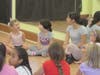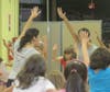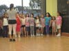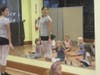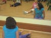 After the introductions and Viens’ speech, she led the troop through a series of stretches which shifted into light aerobic exercise including jumping jacks, then started the music and introduced isolations, the movement of only one, isolated, part of the body. The girls followed shoulder and legs rolls - out of time - but enthusiastically. A few light dance moves followed: simple steps in Hip-Hop, the running-man. A freeze-dance was a highlight for the girls. Viens directed them to vigorous freestyle dance which ended with a struck pose the moment she turned off the music. The girls watched her control the studio stereo with palpable anticipation. The girls worked through the energetic instruction as a group, as individuals in an exercise with a length of rope and a hula hoop, and in partner combinations.