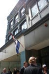 They began their tour at , a non-profit offering youth (ages 12 to 24) an opportunity for paid employment in the arts and a voice in their community. The tour began with a short introduction by Rebekah Greenwald, executive director of RiverzEdge. A brief tour of the facilty was led by Kyla Foster, the organization's Americorp Vista volunteer. She showed off the design studio, equipped with Macintosh computers loaded with creative software, allowing students to learn HTML and web design, and the screen printing shop, where Reed and Landesman tried their hand at printing designs on a few T-shirts.