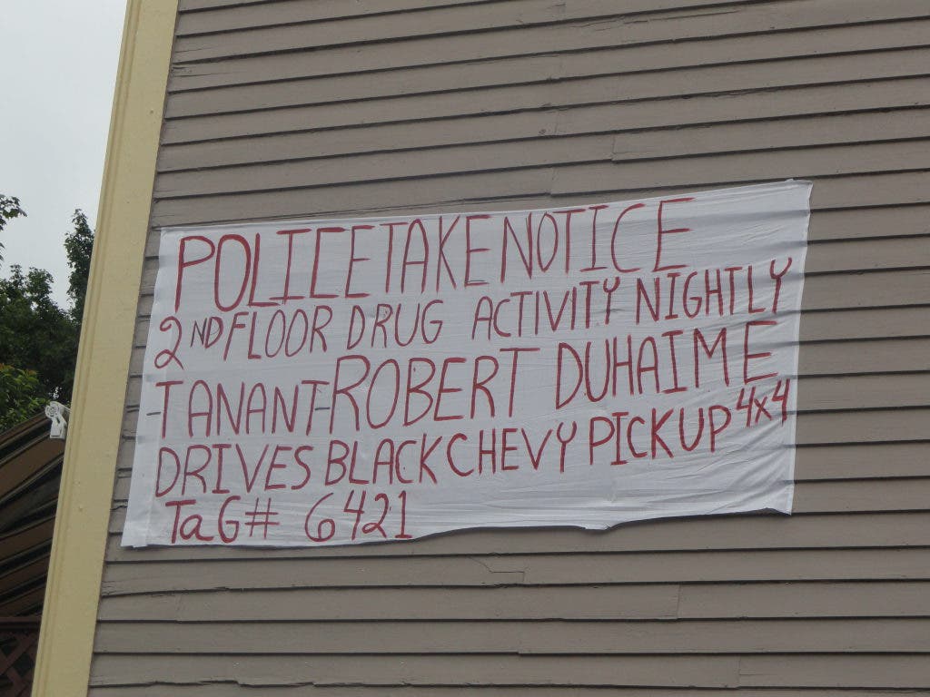 Robert Duhaime, 57 of 22 Dexter St. was arrested on Thursday after an incident involving his downstairs neighbor, Richard Unwin. According to reports, Unwin had hung a sign on the side of the men's shared apartment building warning police of Duhaime's supposed prostitute and drug activity. Unwin and a friend were hanging lights to illuminate the sign when Duhaime came home. The men, who drove separately to the Woonsocket Police Department just after the incident, gave varying reports of how things turned violent, though Unwin and his coworker Mike Massotti told officers that Duhaime walked up saying "take that sign down" and then punched Unwin in the mouth. Duhaime was charged with simple assault and one sign, pictured here, was still hanging on the building as of Friday afternoon.