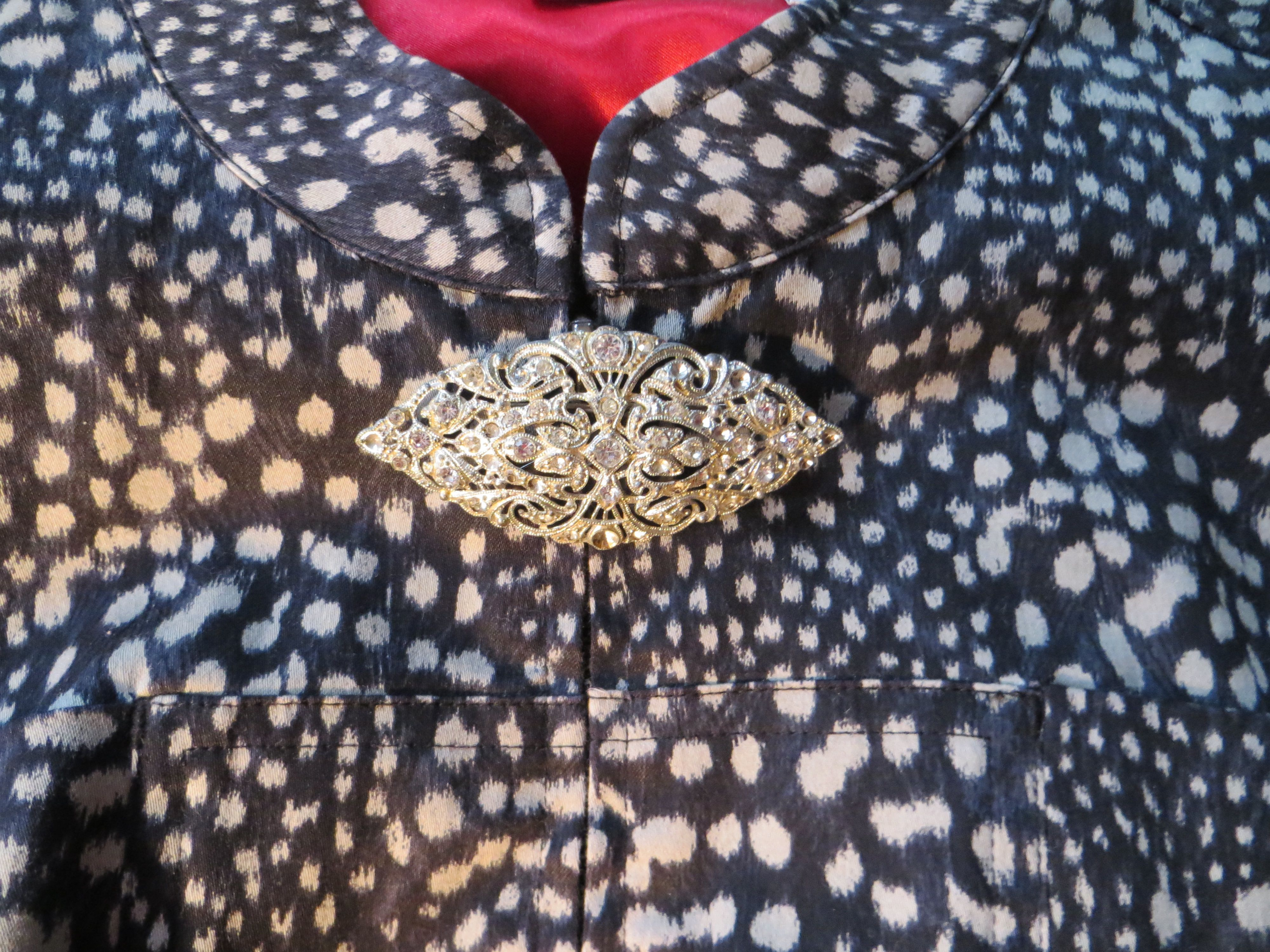 The first thing, of course, is to locate rhinestones that match in size and color. Once you have the stones you need, glueing them in without getting glue all over everything including the top of the rhinestone is easy. Make sure the rhinestone fits and matches by trying it in the vacant hole in the piece of jewelry. When you are sure you have a match, turn the rhinestone upside-down on it's face on a hard surface. Using a toothpick, place a tiny bit of glue into the empty hole. Position the piece over the upside down rhinestone and gently lower it to catch the stone in the glue in the hole. Once you are sure you have caught the rhinestone in the glue in the vacant hole turn the piece over and, if need be, apply gentle pressure. You should not have used enough glue so as to have any push out.Rhinestones are fun to wear with a variety of styles, either dressing up or dressing down. This picture is of a very old brooch placed on a jacket I bought at Chicos a few seasons ago. It blends in wonderfully. The spots on the jacket downplay the glitz of the brooch but OOPS, I see a stone or two missing. I had better glue some into place!