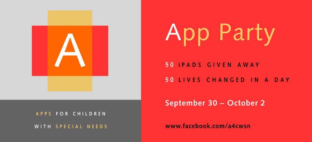 100+ developers will be lowering their App prices from Sep 30 - Oct 2 to benefit Children with Special Needs, 50+ iPads and 5 ipods will be given away and the Party shall take place on a4cwsn's Facebook page and also on A4cwsn - Australia and A4cwsn - Canada