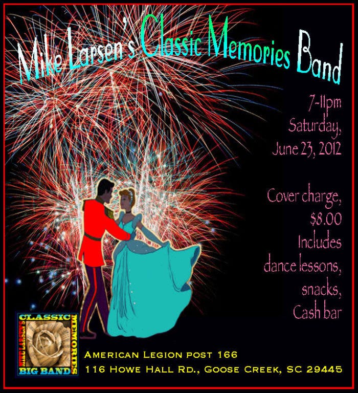Public social dance party with live 1940's Big Band playing a large variety of Swing, Latin, and Ballroom. There will be free dance lessons on the band breaks, free snacks, and a cash bar. The cover charge is $8 and there is plenty of seating, so bring your friends and family. You don't need a partner and you don't have to dance to enjoy this magical evening of great live music!