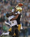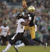 Chris Brown, a Hanahan grad, has been getting attention as one of Notre Dame's freshmen wide receivers. Getty photographer Jonathan Daniel snapped a few shots of Brown trying to make a catch while under pressure from Wake Forest's Chibuikem Okoro.