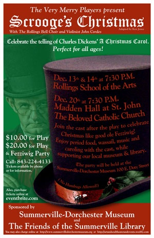 The Very Merry Players present Scrooge's Christmas, the beloved story of Dickens's Christmas Carol! Join the players for an evening of theater, music, and song! After the play, join everyone at the Summerville Dorchester Museum for the Fezziwig Party!! December13,14, and 20th. Tickets 10.00 and 20.00, for information call 843-224-4133.