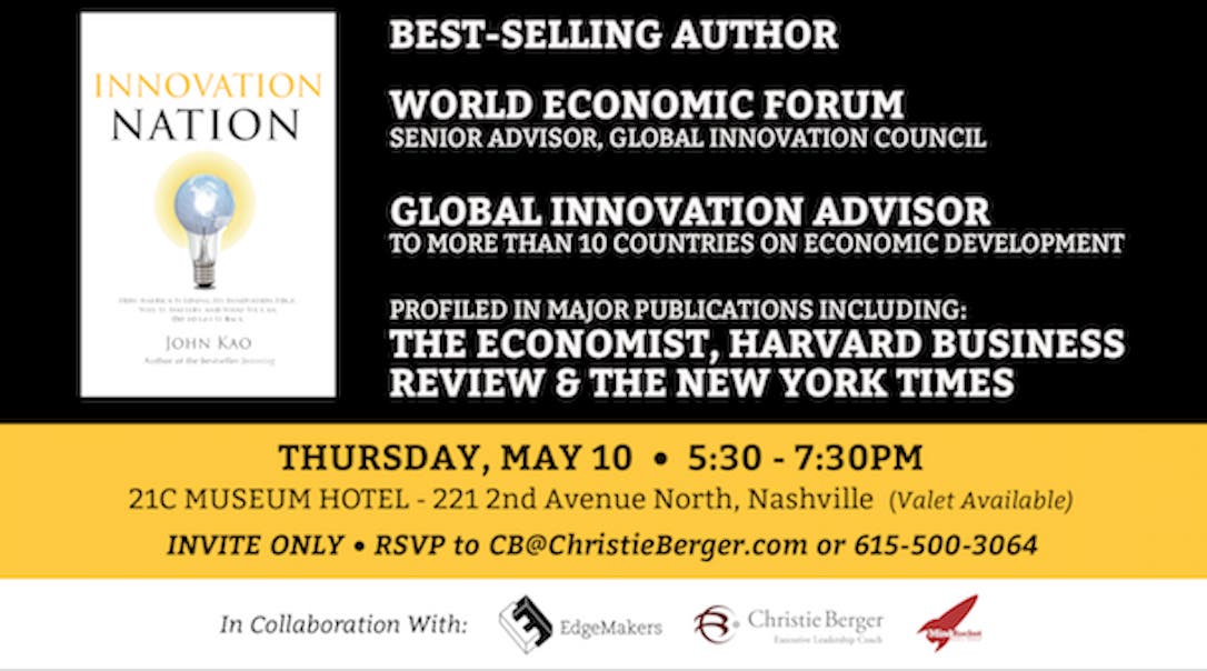 “We are thrilled to welcome John Kao to Nashville for an evening of insight and entertainment. Civic and business leaders will learn how to enter the ‘zone of improvisation,’ in order to support a culture of innovation, disrupt their industries, and effect meaningful change within their organizations, in our city and beyond,” said Dr. Rod Berger. “This is an extraordinary opportunity to hear from one of the greatest thinkers of our time, right here in ‘Music City.’”