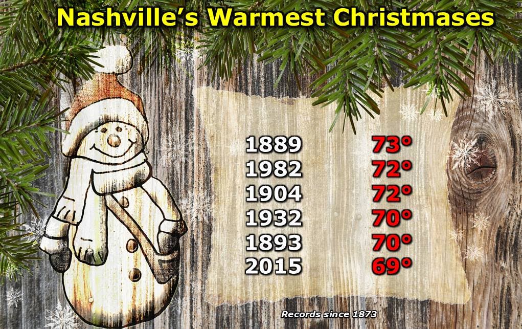 That would be, of course, unusually warm for this time of year. The average Christmas Day high in Nashville is 46 and just five times since records have been kept has the mercury hit 70 or higher on Christmas. The record high for Christmas Day is 73, set in 1889. Last year's high on Christmas was also curiously warm with a high of 69. If the high reaches 70 on Christmas, as expected, it will be the first time since 1982, when the high was 72.
