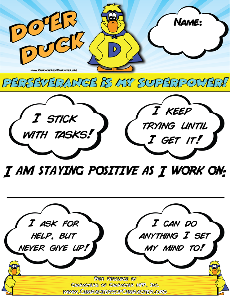 Here are some thoughts to help teach a child perseverance through Do’er Duck who teaches our children to ‘NEVER GIVE UP”