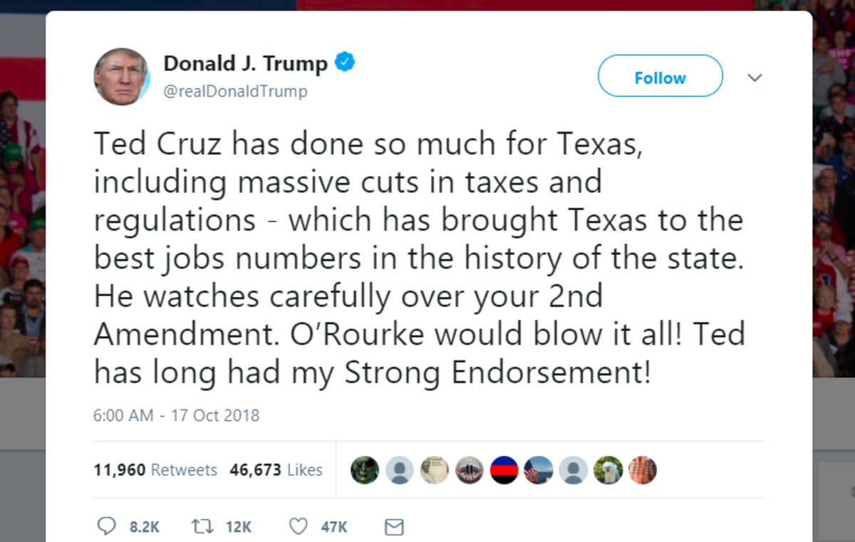 Donald Trump Praises Cruz, Takes Shot At O'Rourke On Twitter