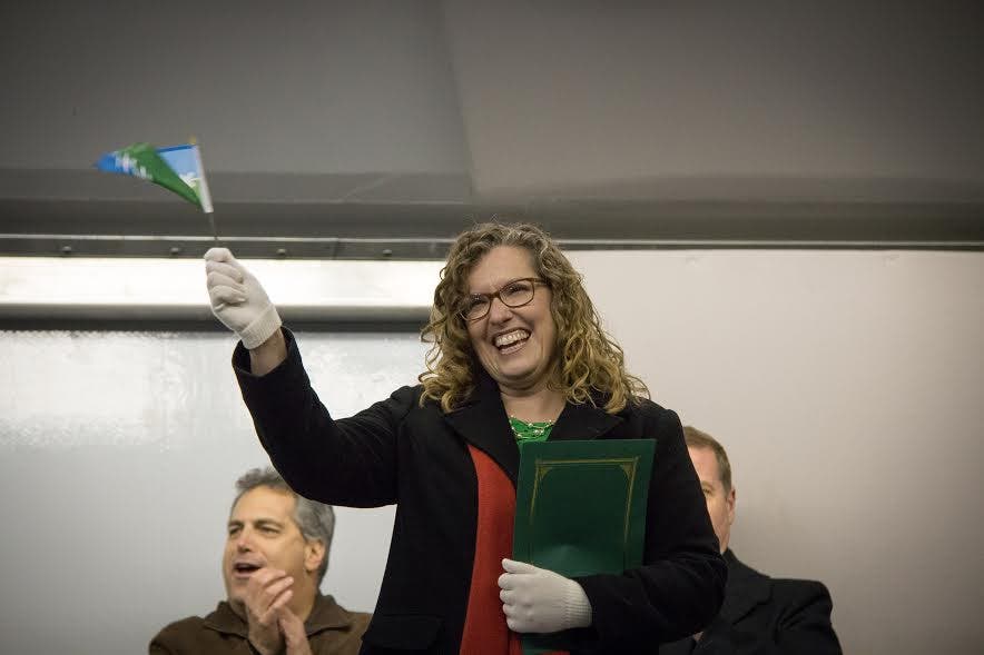 Design by resident Catherine Van Arnam with elements representing city's landscape and history is chosen from 250 submissions.