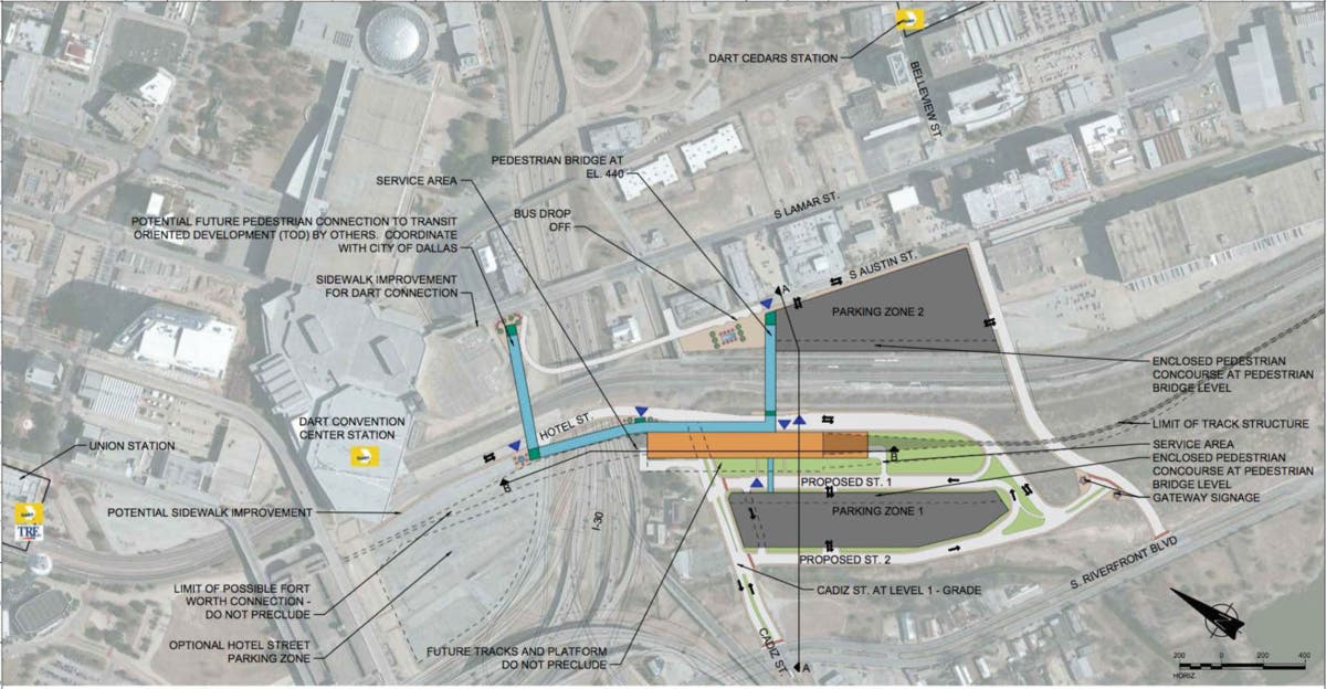 Enclosed, elevated pedestrian bridges would connect it to new parking facilities. The bridges may be extended to provide easy access to public transit, such as DART’s nearby stations at the convention center and Union Station, and an extension of the Trinity Railway Express commuter line from Union Station to the bullet train terminal, the DEIS report said.