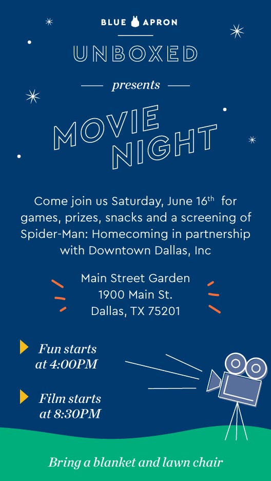 DALLAS, TX — A night of free food, fun and movie-watching awaits attendees at Blue Apron's “Unboxed” event on Saturday in Dallas.
