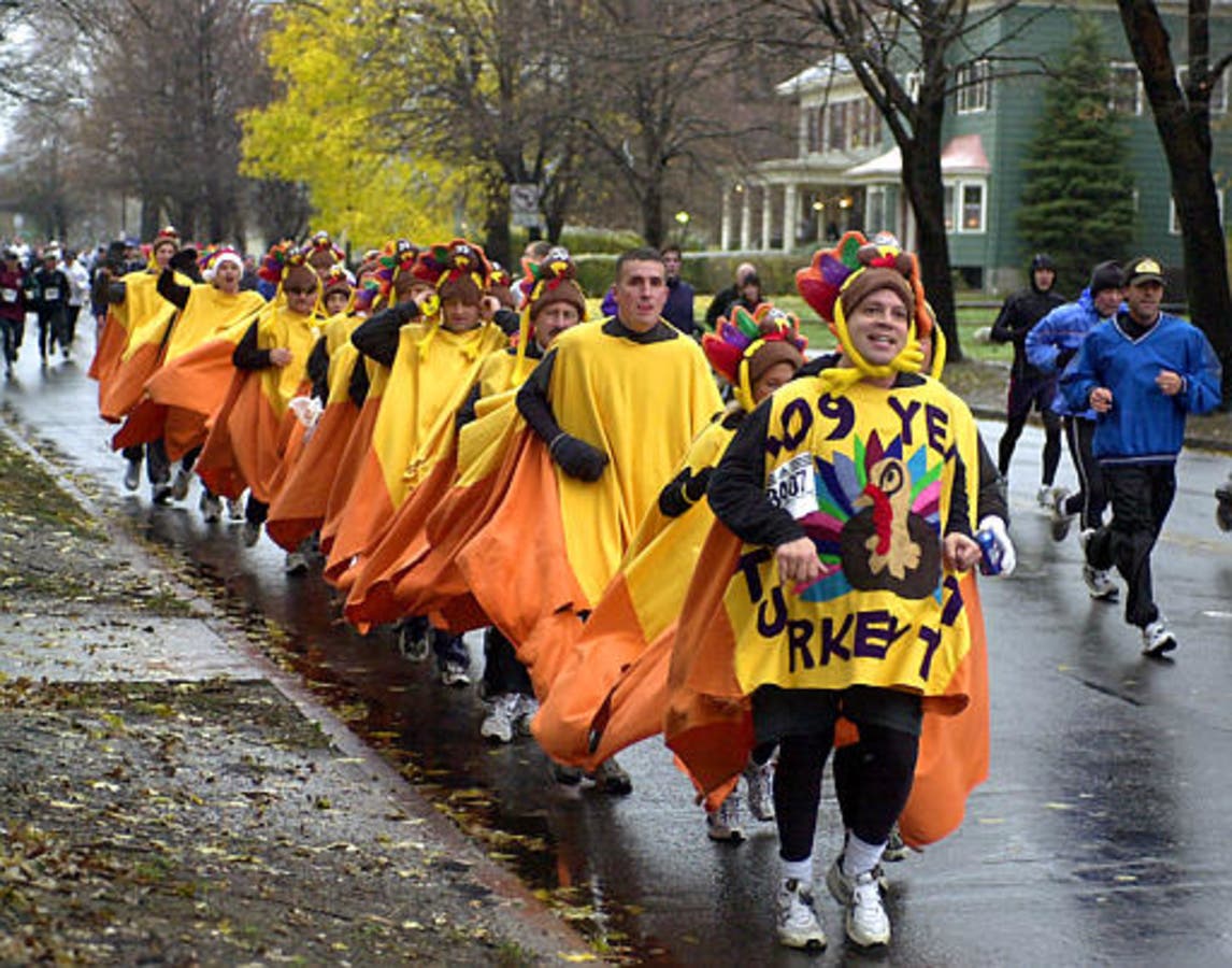 Lead image — file photo: Costumed runners participate in the 109th annual Turkey Trot along Delaware Ave. in Buffalo, N.Y., Thursday, Nov. 25, 2004. The Turkey Trot is the oldest five-mile foot-race in the nation. (AP Photo/Don Heupel)
