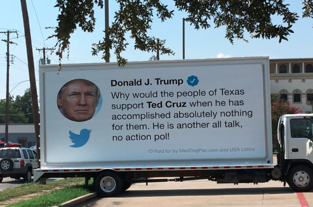 DALLAS, TX — A mobile billboard plastered with a tweet from President Donald Trump denigrating Sen. Ted Cruz has gone viral after it was spotted in Dallas Friday. The billboard, which was purchased by the MAD DOG PAC last week, features Trump's tweet from Feb. 28, 2016 stating, "Why would the people of Texas support Ted Cruz when he has accomplished absolutely nothing for them. He is another all talk, no action pol!"