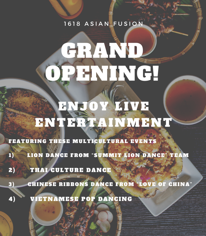 For more information, please www.1618asianfusion.com. 1618 Asian Fusion can be found on Facebook at @1618AsianFusion, as well as on Instagram at @1618AsianFusion.
