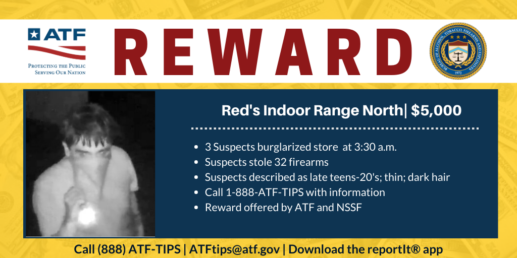 The reward is part of a larger national cooperative initiative between the NSSF and ATF in which NSSF matches ATF rewards in cases involving the theft of firearms from federally licensed firearms retailers, officials said.