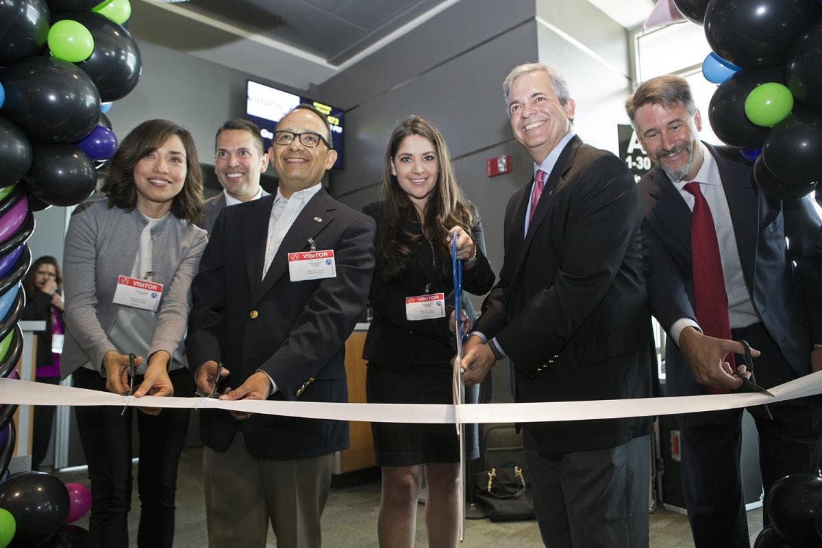 >>> Photo courtesy of Austin-Bergstrom International Airport: Lourdes Gomez, Austin Convention and Visitors Bureau; Carlos Gonzalez Gutierrez, Consul General of Mexico in Austin; Juliana Ramirez, Volaris Ancillary Revenue Manager; Mayor Steve Adler, City of Austin; and Drew Scheberle of the Austin Chamber of Commerce cut the ribbon at the gate to board the Austin to Guadalajara flight.