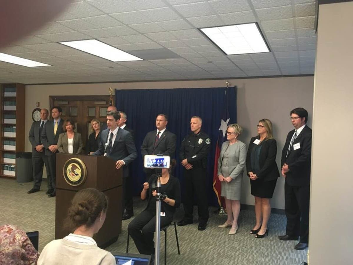 >>> Top image: U.S. Attorney John F. Bash flanked by other law enforcement officials during press conference updating serial bombings investigation on April 9, by Tony Cantú,