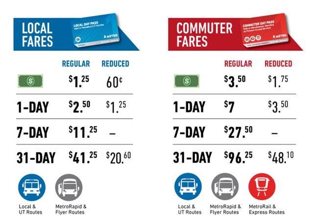 Starting this January, all local MetroRapid and Flyer service will cost the same as Local service bus routes. All service will cost $1.25 for a single ride, $2.50 for a day pass, $11.25 for a week pass and $41.25 for a monthly pass.