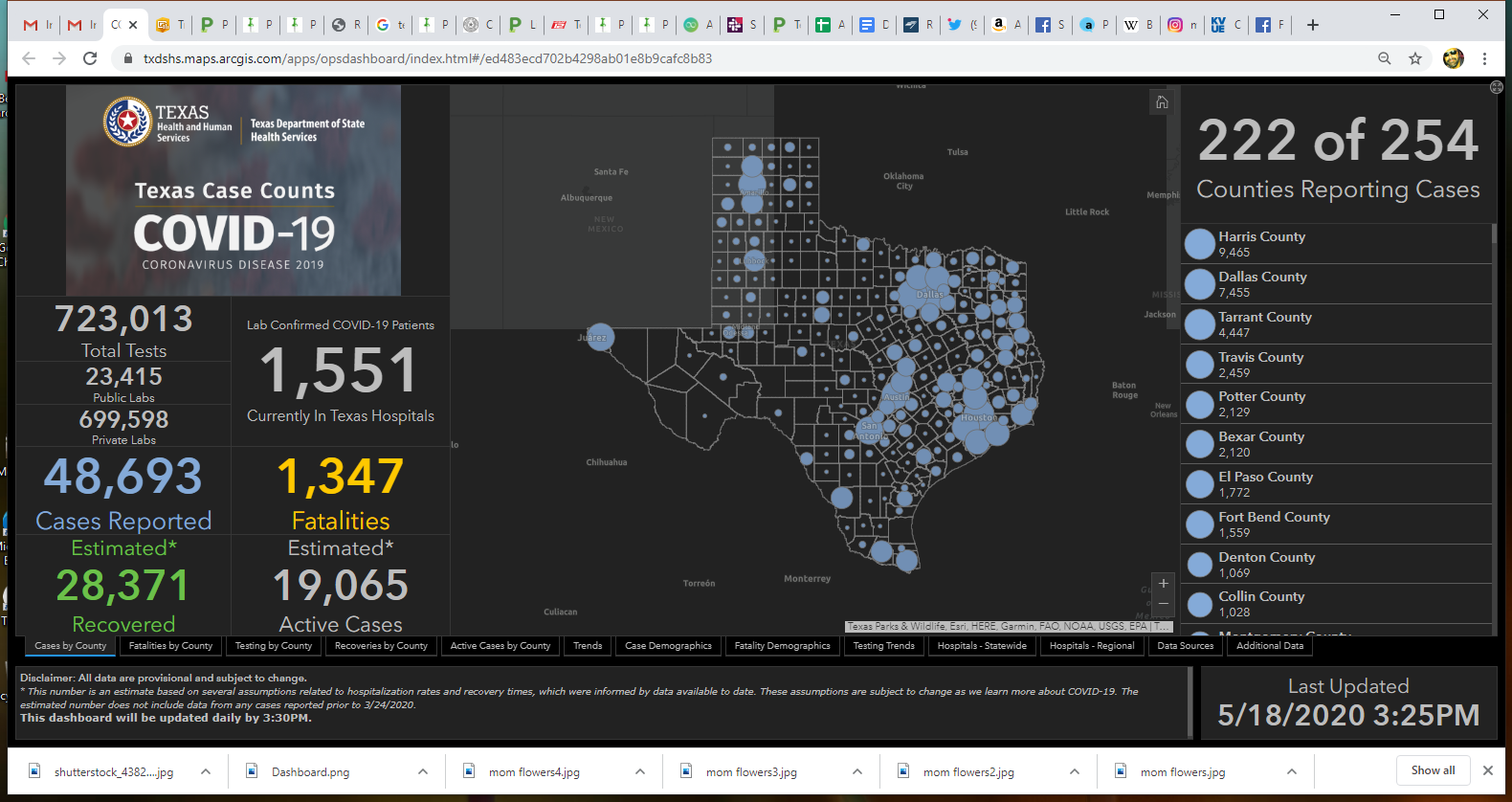 A screenshot of the Texas Department of State Health Services statistical dashboard on May 18, 2020.