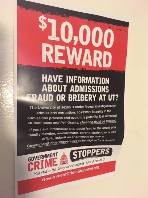 The scandal has led to considerable outcry by those less fortunate in securing admission to some of the country's most elite schools, buttressing suspicions that some have an unfair advantage in the process. As Patch reported on April 4, the national non-profit group Government Crime Stoppers (GCS) recently posted fliers at homes surrounding the UT-Austin campus offering $10,000 rewards for information leading to arrests of even more people found to have cheated on the admissions process at the local university.