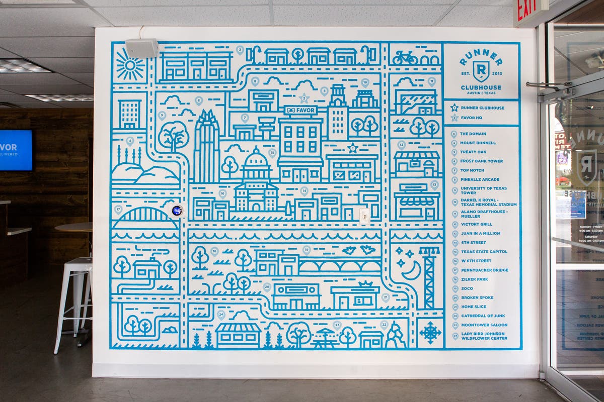 Conveniently located in downtown Austin at 1718b Lavaca St., the Runner Clubhouse features a custom mural hand-painted by members of Favor’s Creative team that depicts iconic spots and landmarks around Austin, a cell phone charging station, restrooms, complimentary refreshment area, community bulletin board, and a take-one-leave-one library, officials explained.