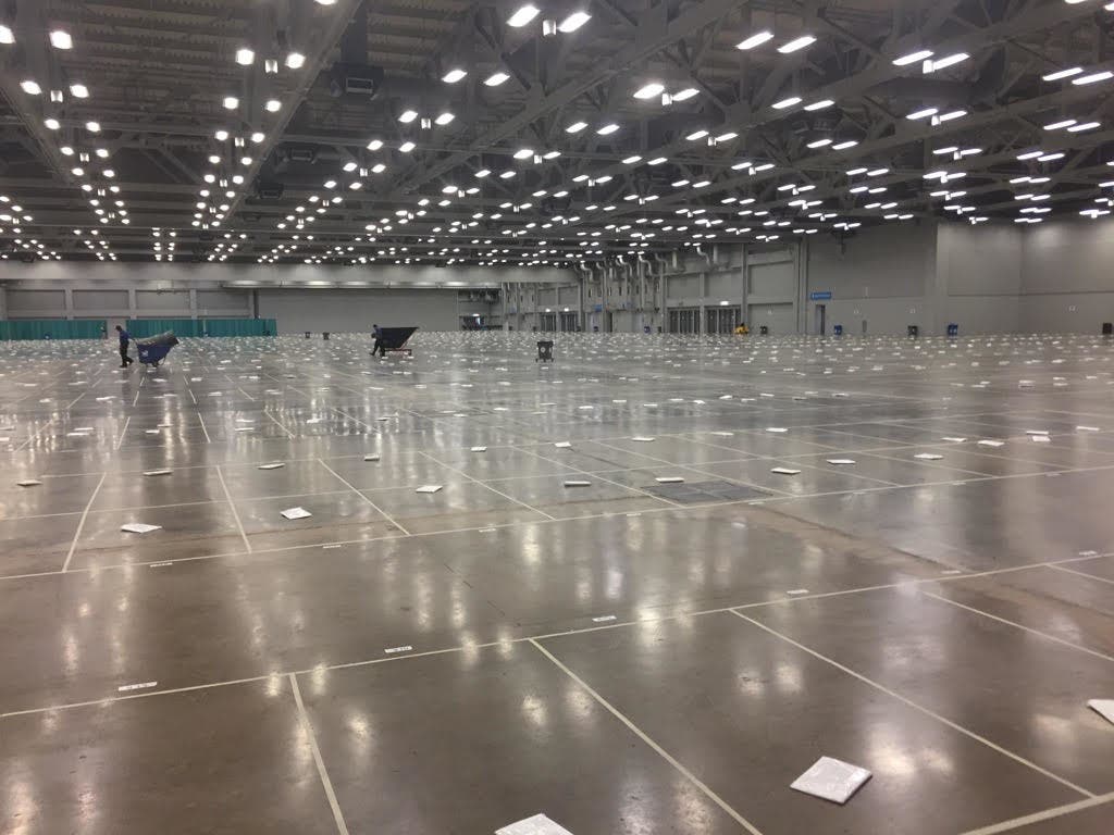 Preparations at the convention center on Wednesday affirmed that sentiment. The expanse of the place has been converted into a huge shelter-in-waiting, with tape delineating spaces for cots, and tables set up for dining. The sight of such prepared makeshift living quarters — for now sans people but poised to receive them — yielded an eerie sight at a place where conventioneers would normally gather, their name badges affixed to their shirts or blouses.