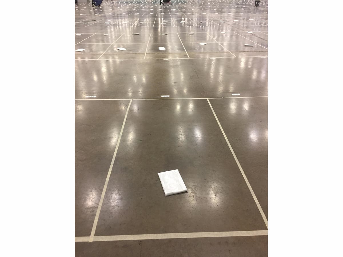 The city has opened its doors to evacuees in the past, housing some 4,000 evacuees from Hurricane Katrina in 2005. The current configuration at the normally bustling convention center shows the template of the city's preparations, with tape serving as temporary border where cots were to be placed. Tables have been moved aside to accommodate the arriving cots.