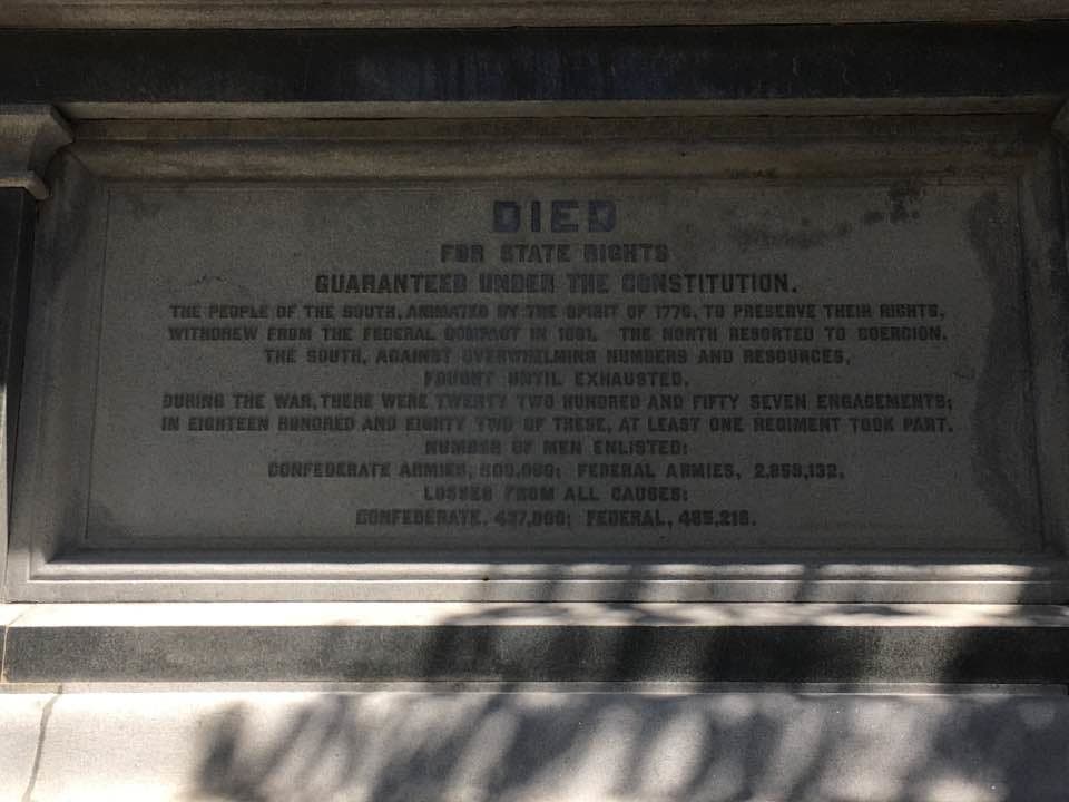 As if the sheer scale of the homage weren’t enough of a tribute, the affixed plaque serves to further glorify the efforts of those depicted: “Died for States' Rights Guaranteed Under the Constitution. The people of the South, animated by the spirit of 1776, to preserve their rights, withdrew from the federal government in 1861. The North resorted to coercion. The South, against overwhelming numbers and resources, fought until exhausted.”