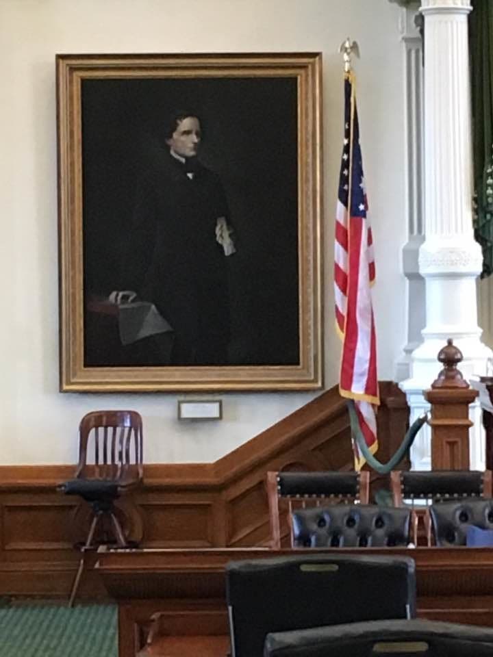 The onetime president of the Confederate holds a special place of honor in the Senate chamber. While other Confederate figures rendered in paint line the periphery of the chamber where 31 senators meet each legislative session to craft laws. But the Davis portrait is hung on the main wall at the room's epicenter, chained off to deter visitors from accessing the area. Davis' portrait is near that of Stephen F. Austin and across from paintings depicting the Battle of the Alamo, serving as something of a centerpiece in a tableau featuring the lieutenant's original walnut desk fronting a reproduction drapery treatment.