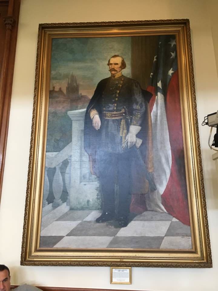Also in the Senate chamber, albeit in a less prominent spot than the Davis portrait, is a picture of Albert Sidney Johnston, a Confederate soldier in full- uniform regalia. Highly regarded by Jefferson Davis as the finest Confederate general officer, Johnston was killed in the early stages of the Civil War at the Battle of Shiloh on April 6, 1862.