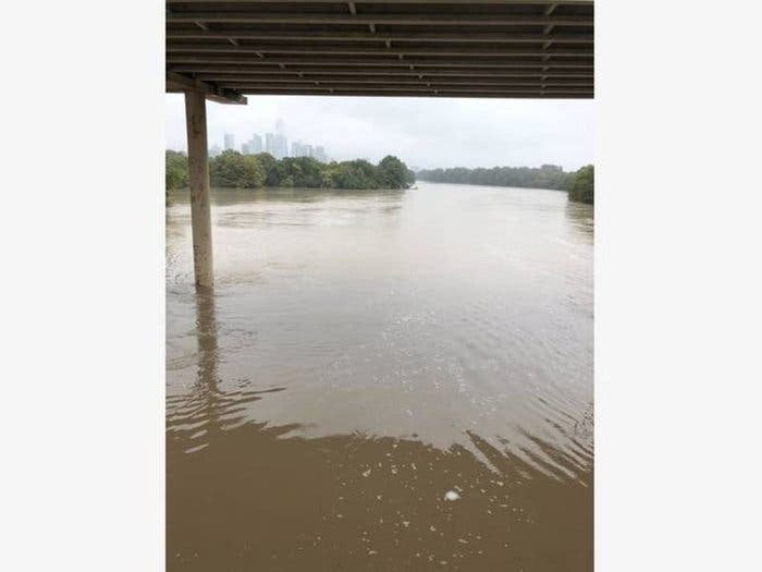 View of the muddied, rain-swollen Colorado River from the MoPac Expressway (Loop 1), just west of Zilker Park, early afternoon on Friday, Oct. 19, 2018. Photo by Tony Cantú/Patch staff