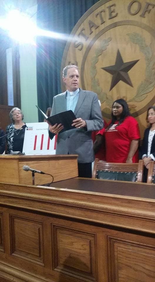 The next speaker, Rev. John Elford of the University United Methodist Church, gently objected to Camacho's "guns for all" scenario, said he also laments unflagging support from fellow members of the religious community. "Here, you have a faith leader deeply troubled by gun violence," he said. He urged like-minded individuals to continue to voice their opposition to HB 1911 even if the challenge seems insurmountable: "I know it feels at times we are bailing out the ocean with a teaspoon," he said.