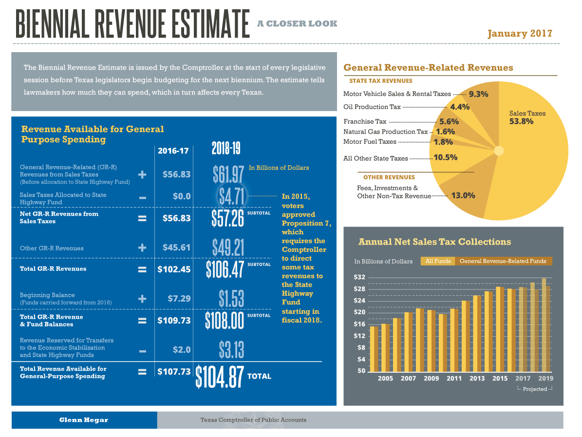 Texas Comptroller Glenn Hegar released the state's Biennial Revenue Estimate on Monday, showing the state is projected to have about $104.9 billion in revenue available for general-purpose spending during the 2018-19 biennium. The total represents a 2.7 percent decrease from the amounts available for the 2016-17 biennium.