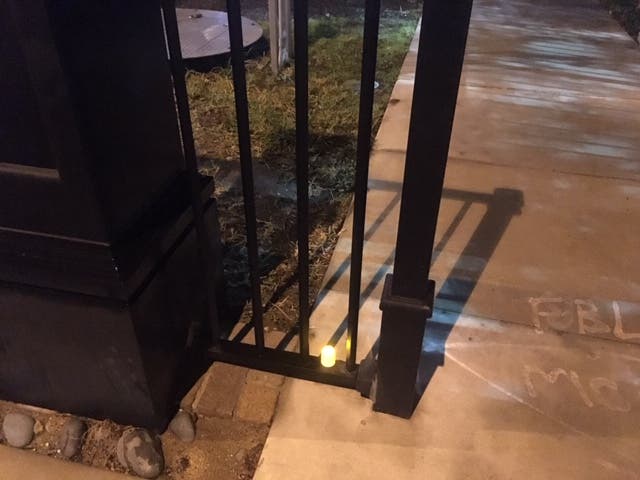 Someone placed a battery-operated votive candle like the ones held by attendees of a vigil carried outside the governor's mansion, yielding something of a tiny beacon before the path leading to the grand house. Photo by Tony Cantú/Patch staff.