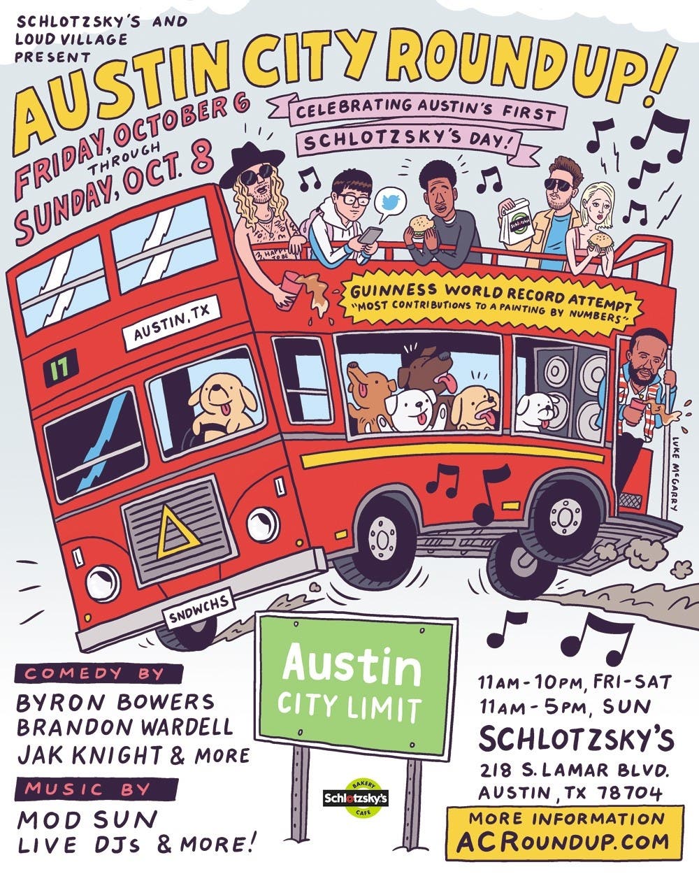 By sheer coincidence, Schlotzky's — which was launched in Austin with a single store along South Congress in 1971 — is celebrating its birthday amid the ACL festivities. To help celebrate both events, they're offering free 30-minute rides along downtown streets on their party bus for Patch readers and others.
