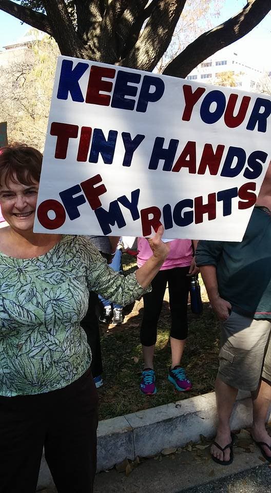 As for Trump's perceived grabby hands: "No, you can't have that," she said. "You can't have that from any of these people," she added, pointing to the huge crowds primarily comprising women but dotted with men expressing their support of women's rights too.