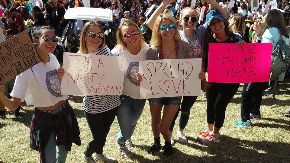 The peaceful protest was in response to what many categorize as divisive rhetoric by Trump as it relates to women. Some of the signs carried by marchers made reference to a surreptitiously recorded videotape emerging during the primary campaign of Trump explaining to a celebrity reporter of his ability to touch women's private parts by virtue of his fame and power.