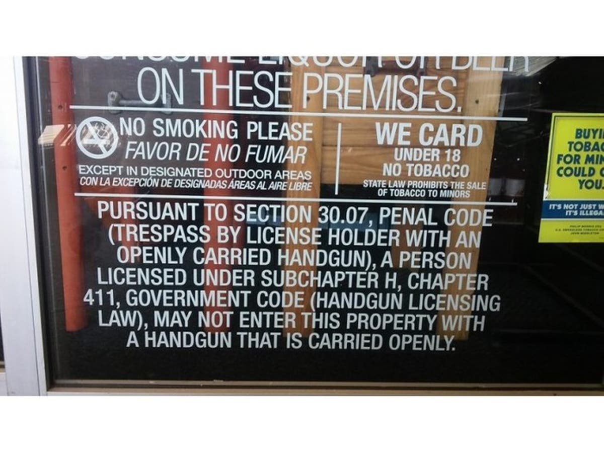 Texas law also supplants the companion open carry laws in prohibiting people from bringing firearms into courtrooms. Also, private businesses are allowed to opt out of the law as untold scores have done in the immediate aftermath of gun carry laws' passage by posting specially tailored signs alerting to such bans.
