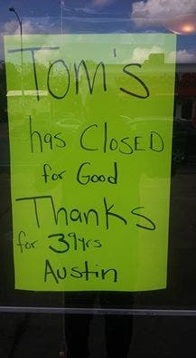 According to a makeshift sign outside the shuttered site at 2928 Guadalupe St., the restaurant had been in business locally for 39 years. "Tom's has closed for good," read one sign. "Thanks for 39 years." Even in the midst of the closure, staff retained a sense of humor, managing a play on words on another sign: "We feel fal-awful!"