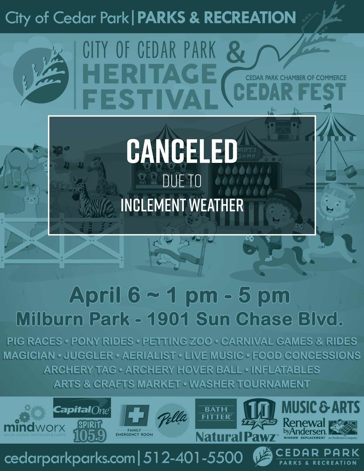 In Cedar Park, the highly anticipated Heritage Festival was canceled as a result of the weather. The event had been scheduled from 1 p.m. to 5 p.m. in Milburn Park, 1901 Sun Chase Blvd. The annual family-friendly Cedar Park Heritage Festival features live music, inflatables, pony rides, carnival games, a petting zoo and much more.