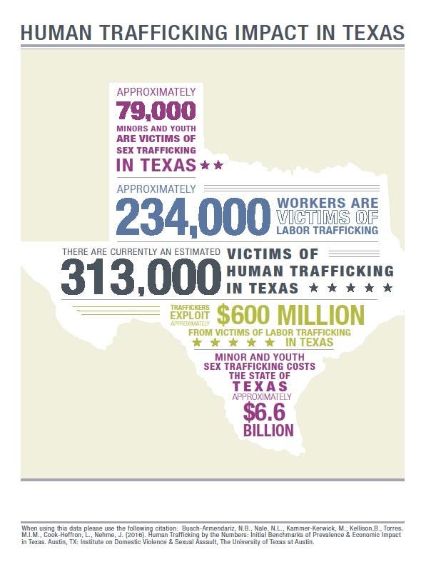The study was conducted by the Institute on Domestic Violence & Sexual Assault at the university's School of Social Work. Among its findings: Of the more than 300,000 victims of human trafficking in Texas, almost 79,000 are minors and youth victims of sex trafficking and nearly 234,000 adult victims of labor trafficking.