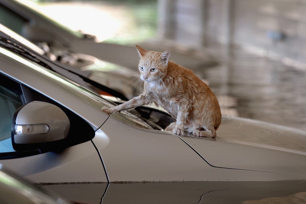 A cat sits on top of a car which is surrounded by flood water in the parking lot of a Houston apartment complex after it was inundated with water following Hurricane Harvey. (Photo by Scott Olson/Getty Images)