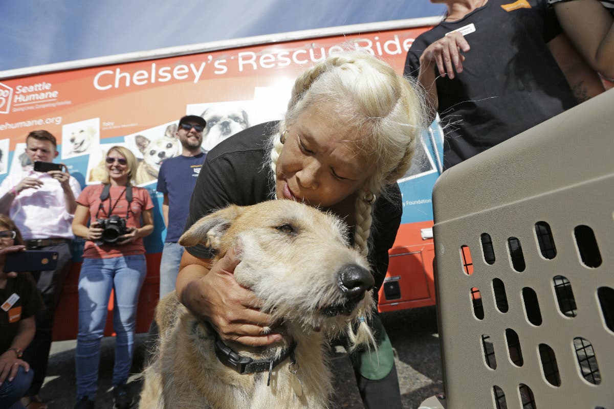Wings of Rescue volunteer Cathi Perez leans down to embrace rescue dog Sandy, the last of a load of 35 dogs from Texas shelters flown to make space for companion animals rescued in the Hurricane Harvey aftermath, in Seattle. (AP Photo/Elaine Thompson)